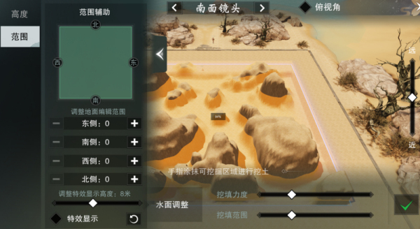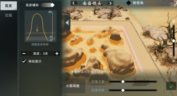 在“高度辅助”中,玩家可自由调节辅助面的高度,确定所需要的地形高度;也可以选择“范围辅助”,自行调整区域范围的数值,选择需要施工的区域,更加精准捏地形的范围,进行丰富多变的创作。