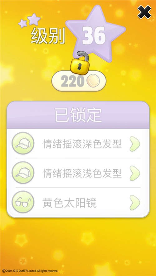 36级:220金币、情绪摇滚深色发型、情绪摇滚浅色发型、黄色太阳镜;
