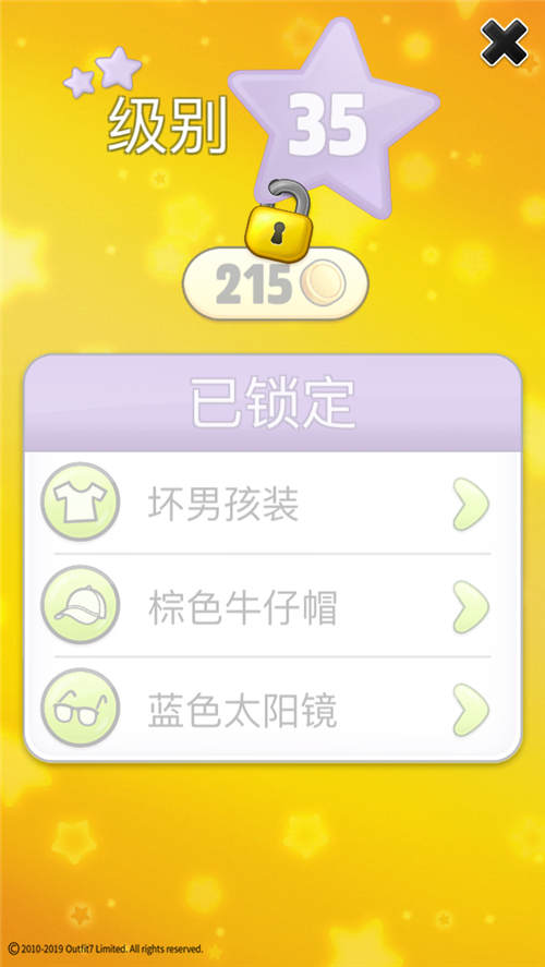 35级:215金币、坏男孩装、棕色牛仔帽、蓝色太阳镜;