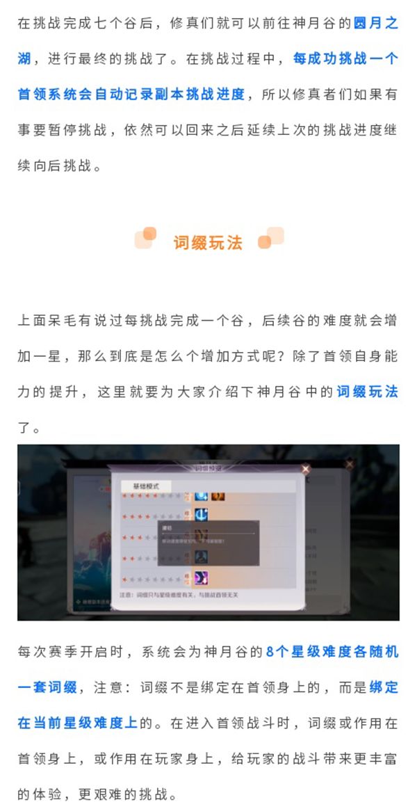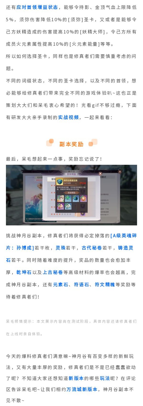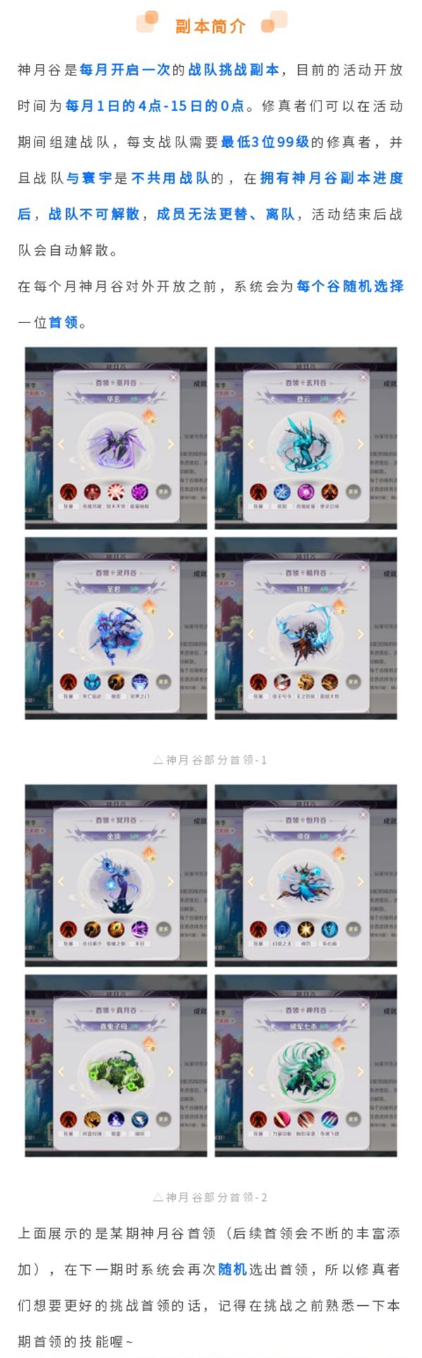 修真者们,呆毛的本期爆料,为大家带来的是本次更新的重头戏之一【神月谷】副本,与常规的日常挑战副本不同,这是一个赛季制的组队活动副本,旨在给到修真们日常副本外更多的游戏体验,下面来跟呆毛一起看看吧~
