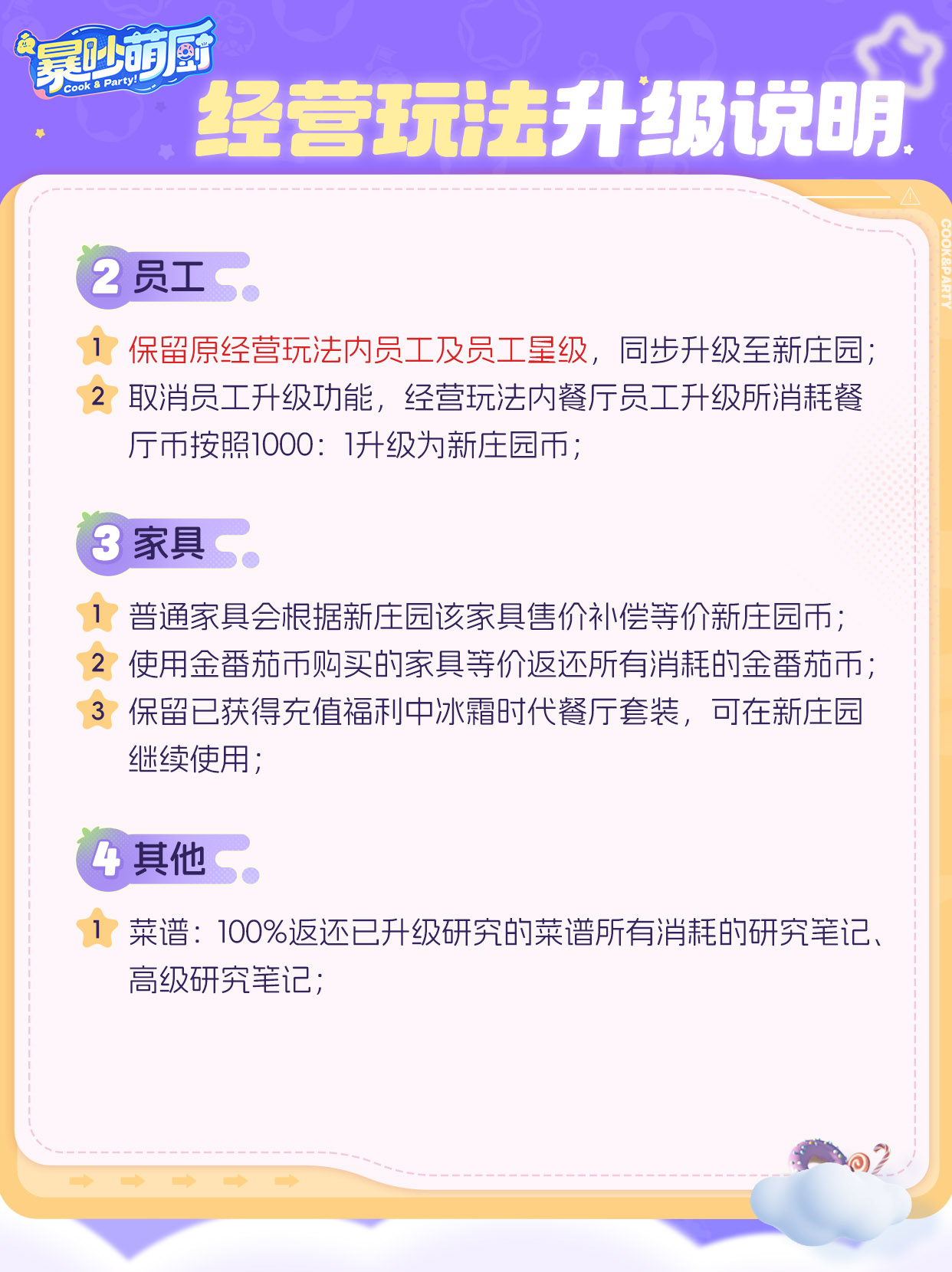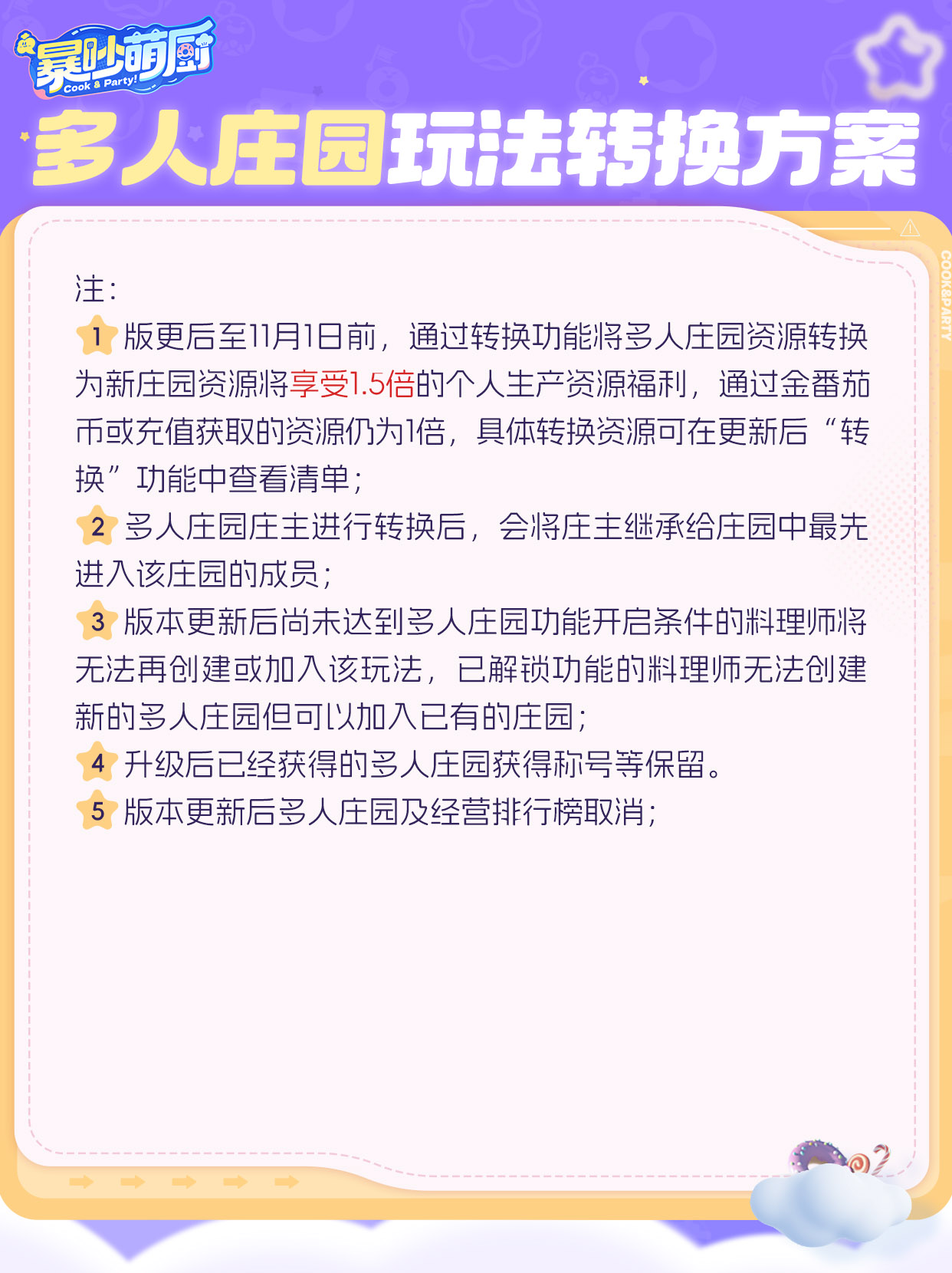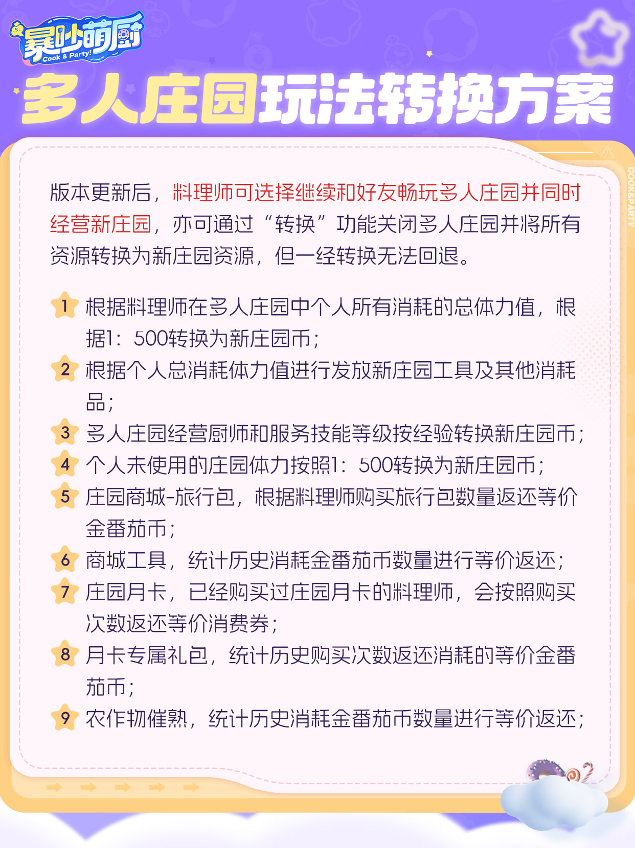 版本更新后,料理师可选择继续和好友畅玩多人庄园并同时经营新庄园,亦可通过“转换”功能关闭多人庄园并将所有资源转换为新庄园资源,但一经转换无法回退,还请注意。