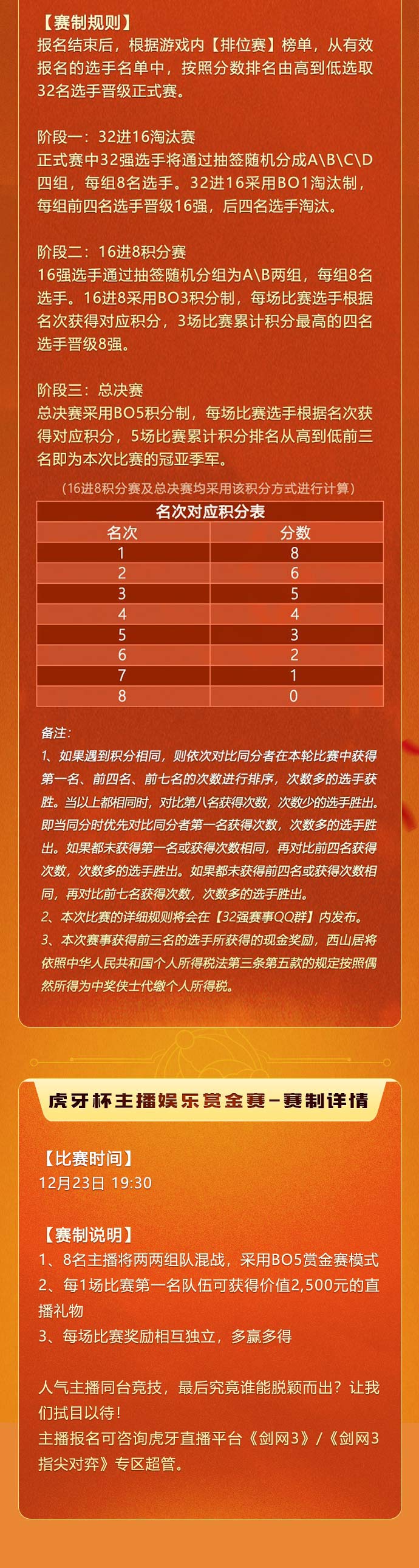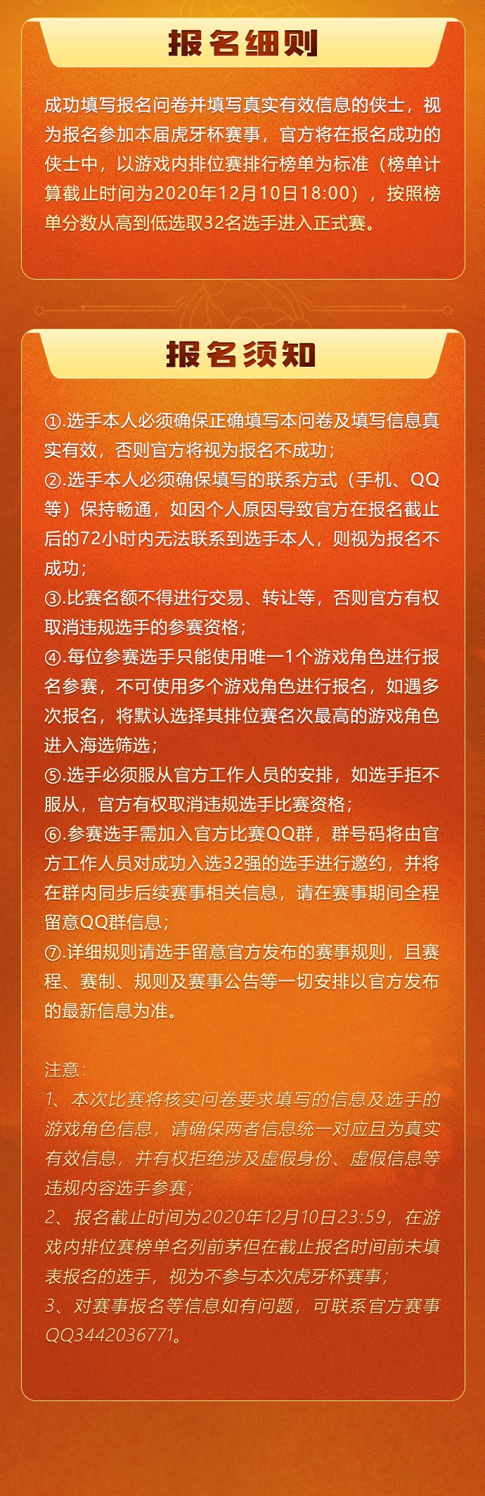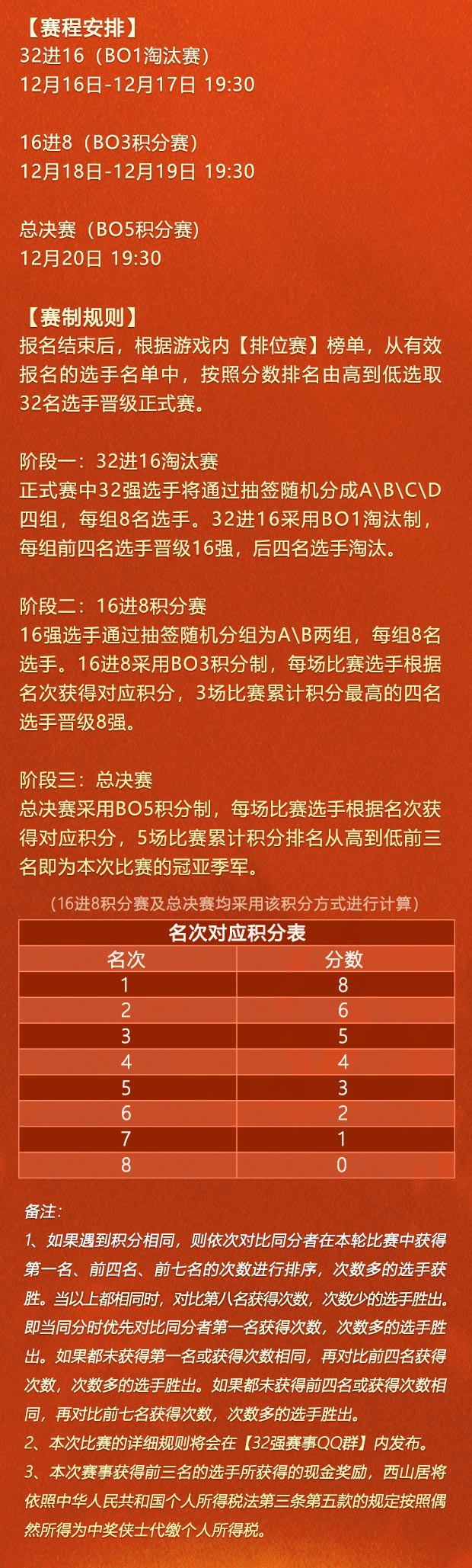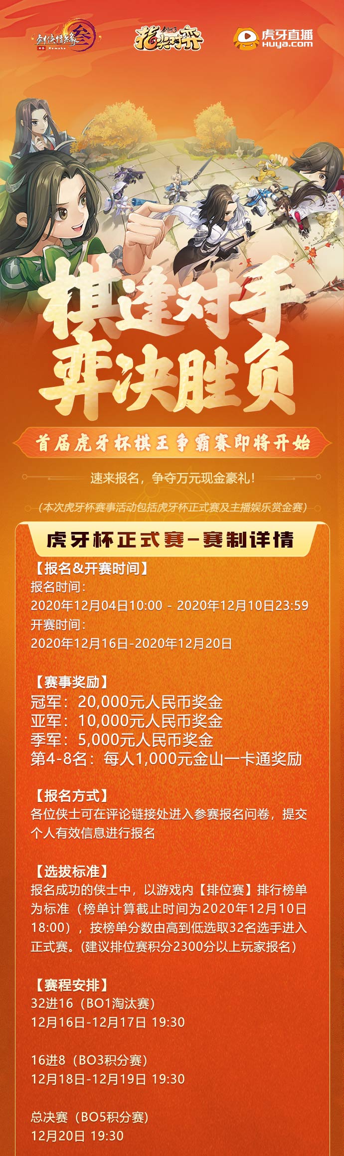 【大唐棋圣留名于此——报名简要】2020年12月10日23:59前,游戏内查看公告即可报名!报名成功的侠士中,以游戏内【排位赛】排行榜单为标准(榜单计算截止时间为2020年12月10日18:00),按照榜单分数由高到低选取32名选手进入正式赛。(建议排位赛积分2300分以上玩家报名)