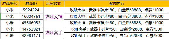 攻略大神(3名):武器卡碎片*80、白金币*8888、点券*1000