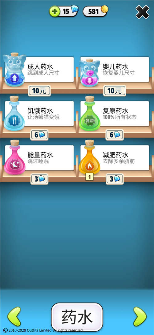 《我的汤姆猫》游戏中,除去减肥药水外,玩家还可以购买一些婴儿药水或者复原药水,婴儿药水是能让汤姆猫变回婴儿的样子,复原药水是复原汤姆猫原本的样子,这两个药水都能让汤姆猫在体型上有一个飞跃的改变。