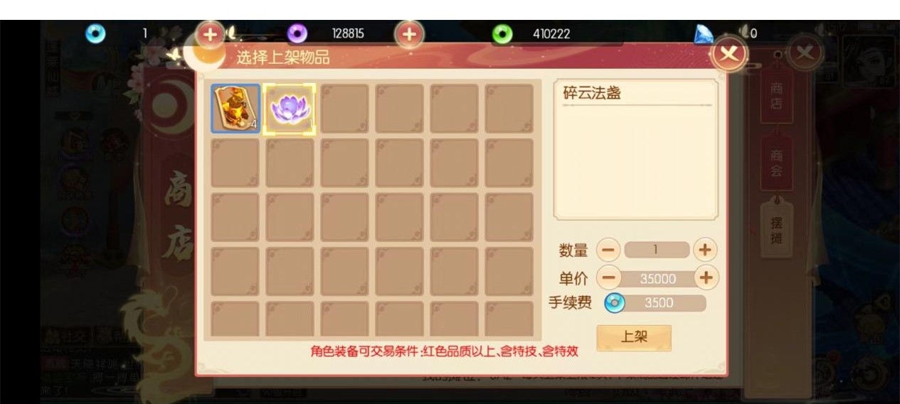 摆摊就相当于一个玩家之间的“跳蚤市场”,除了宠物图鉴以外你还能买到宠物和人物装备,各阶的秘宝也有噢(这个比较抢手)在这里你也可以出售自己获得的各样物品,小妮就准备上架一件偶然获得的红色法盏,游戏里红色装备还是十分值钱的。