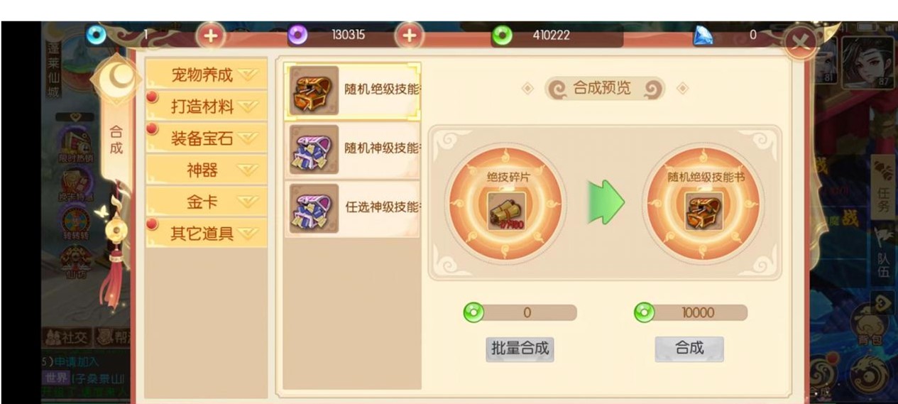 合成位于游戏界面右下角十分显眼的位置,前面有提到合成可以将许多低价值物品转化为高价值物品,那具体又有哪些物品呢?合成十分贴心地将物品分成了六个板块【宠物养成】、【打造材料】、【装备宝石】、【神器】、【金卡】、【其他道具】