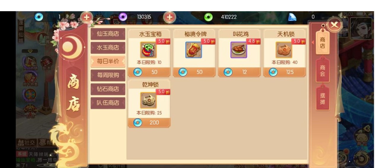 然后就是关于【商店】功能,该玩法位于游戏界面左上角。在商店界面可以购买到很多平时买不到的珍稀物品,特别是每日半价和每周限购,里面的商品具有极高的性价比。水玉宝箱可以迅速补充因为强化或者锻造装备消耗的水玉,任选坐骑礼包更是可以让你的座驾从此超凡脱俗。