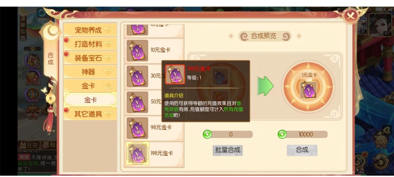 宠物养成主要是将获得的技能碎片进行升级变成绝版技能和神级技能;神器可以将在活动获得的神器碎片进行修复,合成一把完好的神器;金卡比较有趣,可以利用我们平时获得的银卡搭配银卡升级券变成金卡,金卡和银卡的区别在于前者使用后充值额度可以计入各种充值活动(且可以触发首充双倍的福利)宠物养成,神器和金卡前期并不会有太多使用,所以我们一笔带过。