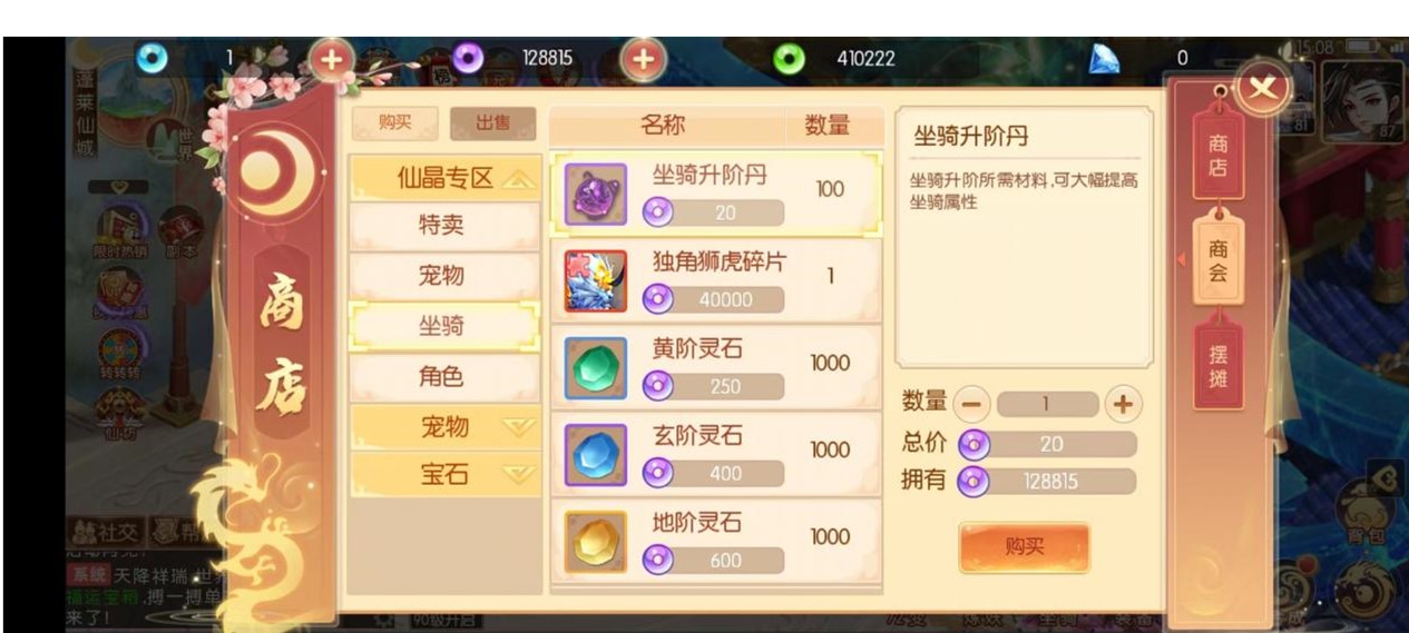 当然除了商店功能还有商会和摆摊功能。商会中的仙晶专区建议每天都去扫一扫货、特卖区里的富运密钥,鸿蒙之息以及秘境令牌是小妮每天都会去购买的,因为平时想获得这些物品还是十分困难的(坐骑区还有独角狮虎碎片,十分酷炫)