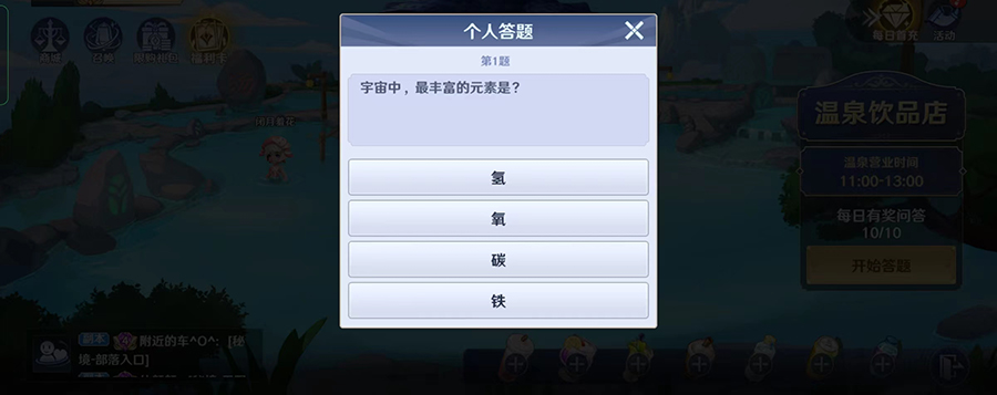 在泡温泉的过程中,各位冒险者大大可以参与答题活动,一共10道题,每答对1道题即可获得一次奖励哦,奖励包括史诗宝物碎片、宝物充能精华、升星材料神兵精粹等等。