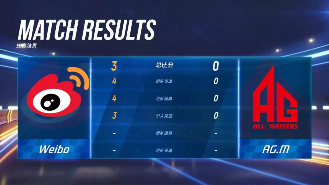 但在比赛开始后,Weibo战队实力强劲,大显神通。先在团队竞速赛中,将对手AG.M远远甩在身后,以4:0的战绩在团队竞速赛中快速击败了AG.M。接着在团队道具赛中,Weibo战队完全颠覆了往日团队道具赛欠佳的表现,基本没给对手任何机会,再度以4:0的战绩完胜AG.M。