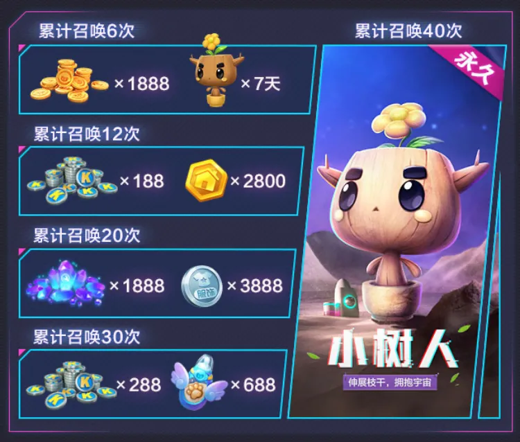 各位车友只要在活动时间内完成每日登录、参与多人对局、参与排位、累计经验达成等任务,就能获得召唤次数,召唤至指定次数时会获得对应的奖励,召唤满40次即可获得史诗级宠物小树人(永久)。