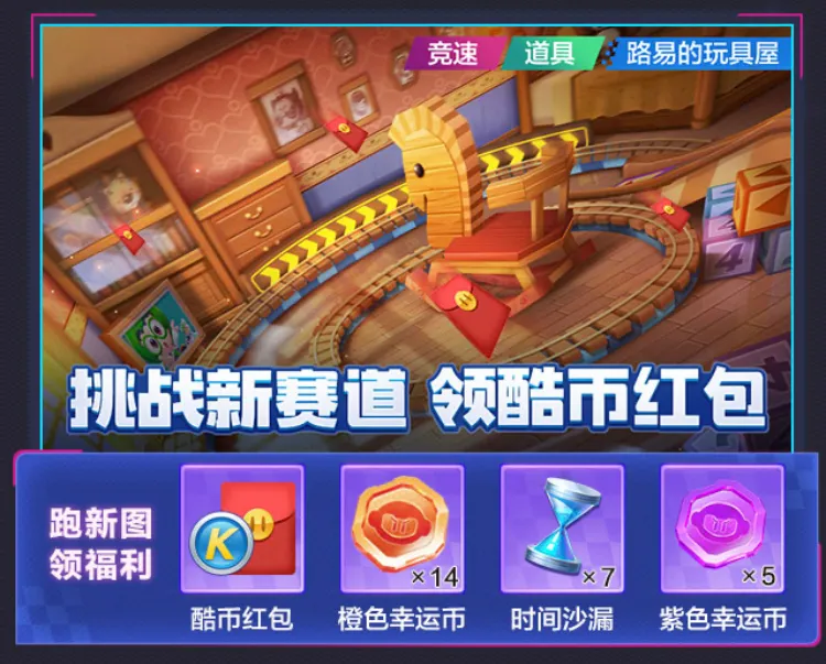 全新赛道——路易的玩具屋,等着大家来挑战。活动期间,挑战新赛道有超丰厚的福利,其中包括酷币红包、橙色幸运币、时间沙漏与紫色幸运币,各位车友一起来挑战吧!