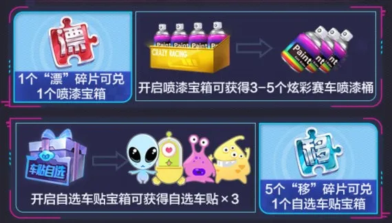 活动期间,跑图每日掉落10个“漂”碎片和10个“移”碎片,1个“漂”=1个喷漆宝箱,开启可获得3-5个喷漆,5个“移”=1个自选车贴宝箱,开启可获得自选车贴*3。活动期间,总计可获得150-250个炫彩喷漆桶及30个车贴!喜欢涂装的朋友们可千万不要错过啦~