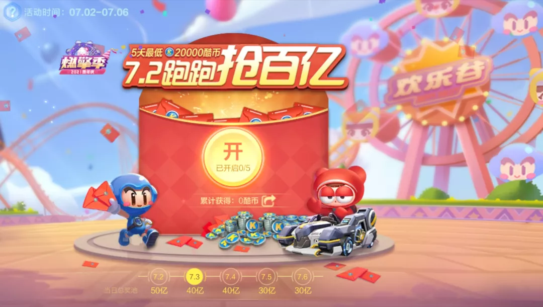 7月2日-7月6日,车友们只需登录游戏,即可参与抢百亿酷币的惊喜活动!每日有5次开红包的机会,可随机获得不同金额的酷币。保持全勤5天,最低也可抢到20000酷币,还可通过活动页面分享红包给好友!车友们千万不要错过这次良机~