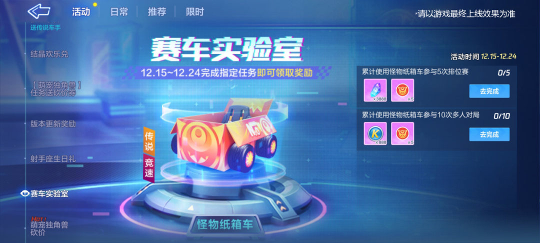 与众不同的氮气,与众不同的实力!12月15日起,新一期赛车实验室上线,【怪物纸箱车】返场归来,带着怪物氮气再次冲入赛场,享受不一样的氮气体验!