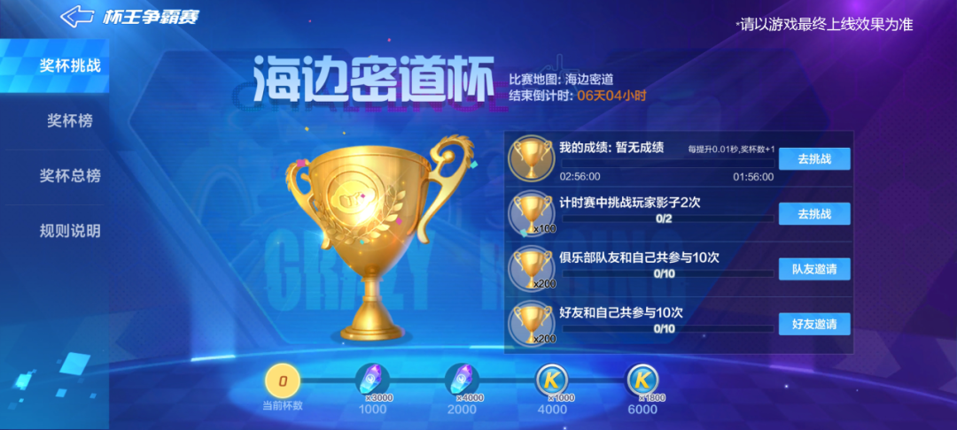 活动期间,车友们可通过完成活动的对应任务获得奖杯,用以兑换能量水晶和酷币。另外,奖杯总榜结算时前三名车友,更可获得对应赛道的永久车牌和赛车抵金券!