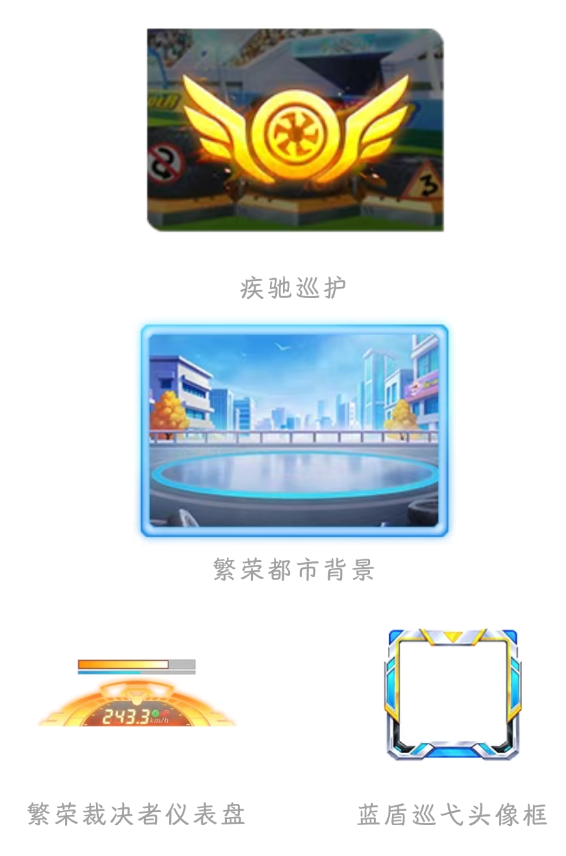 全新颁奖台特效【疾驰巡护】、背景【繁荣都市】、【蓝盾巡弋头像框】、【繁荣裁决者仪表盘】也将与【S-繁荣裁决者】一同降临,打包带走更可享受超值电池优惠,帅气套装一次拥有,尽享裁决者顶级荣耀!
