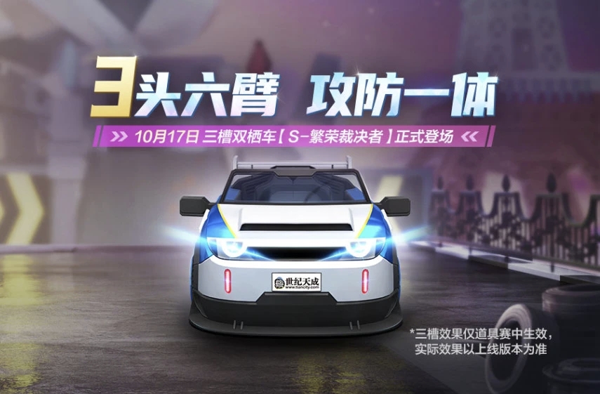 战术的史诗级变革,三倍火力,三重防御,无可匹敌的裁决者即将到来,攻防一体火力全开,见证新的时代!10月17日起,蓝盾巡戈电池购活动开启,全新系列传说三槽双栖车【S-繁荣裁决者】降临,竞速道具双荣耀,还有颁奖台特效【疾驰巡护】、背景【繁荣都市】、【蓝盾巡弋头像框】、【繁荣裁决者仪表盘】待你获取!