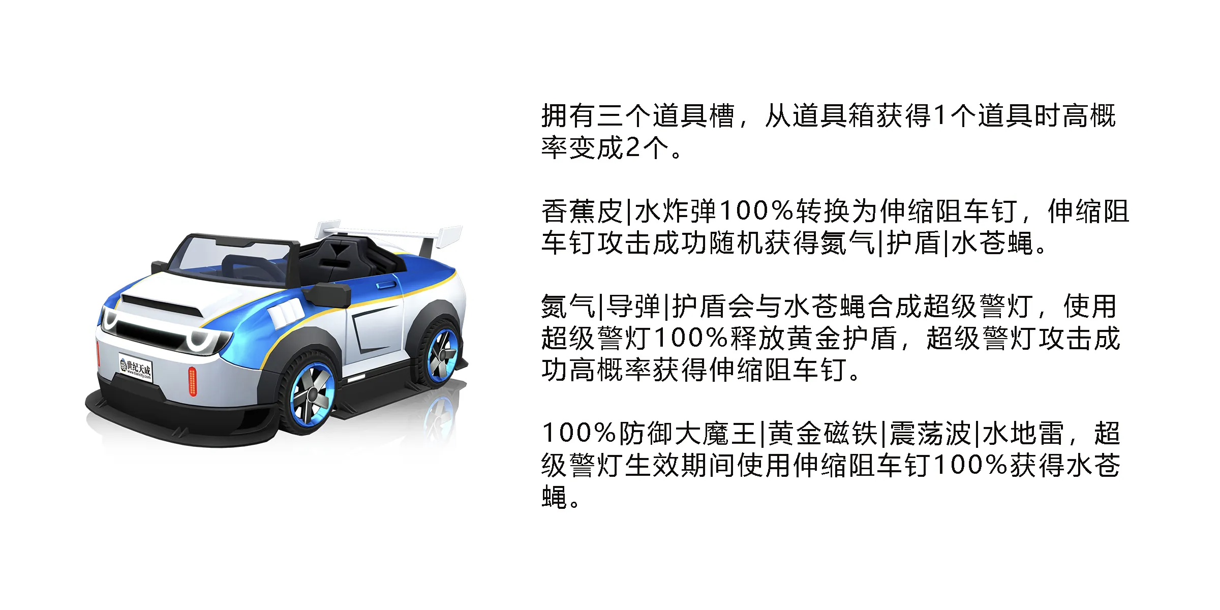 既是裁决者,亦是领跑者,赛道上更要遥遥领先!香蕉皮、水炸弹100%转化伸缩阻车钉。伸缩阻车钉:向车后方一条阻车钉,会使命中的三辆赛车迅速减速,随后失效。将目标狠狠甩在身后,攻击成功后更可随机获得氮气/护盾/水苍蝇,加速/防御/攻击三方向,落后可加速反攻,领跑可防御拉开差距,怎么拿都有面。