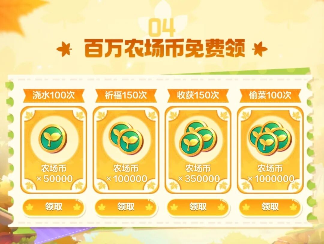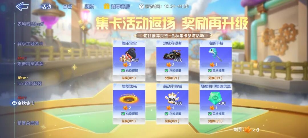 秋意金黄,驱散热意送来凉爽,是幸福丰收的时节!10月31日,全新金秋集卡活动开启,每日登录即可领取海量星愿结晶,完成任务更可获得百万农场币,还有【舞王宝宝(90天)】、【地狱守望者(60天)】、【萌动小熊猫(30天)】等精品好礼等你兑换!