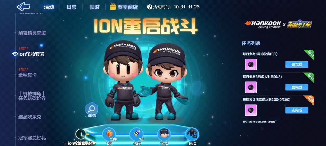 酷黑帅气,时尚耐穿,低调品质富有内涵,穿ion韩泰车手服饰,开韩泰轮胎赛车,幸福无需多言!10月31日,参与活动积攒碎片即可免费领取全新【ion轮胎套装】,鸭舌帽一戴,除了漂移谁都不爱~