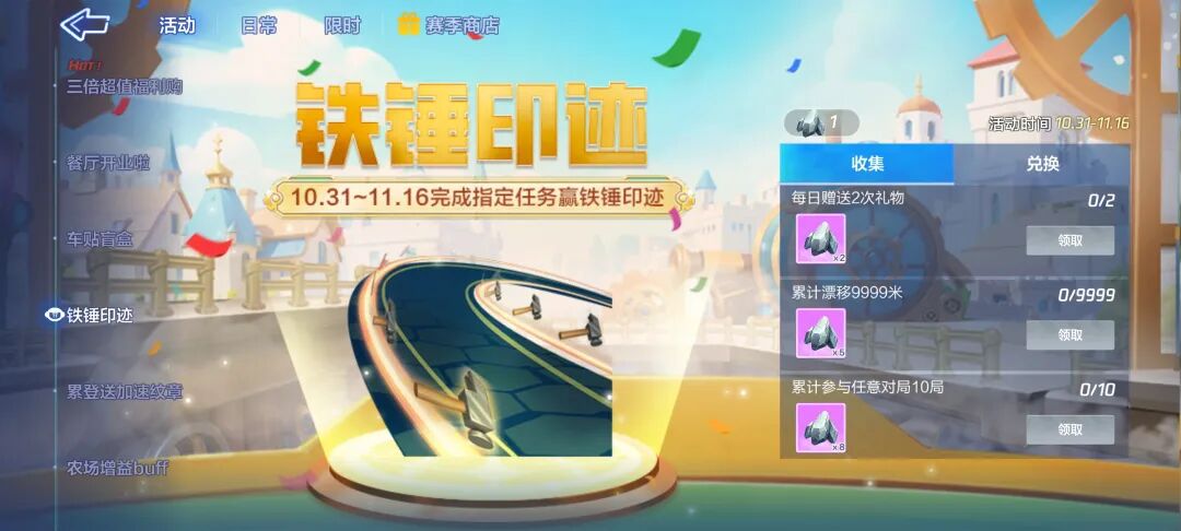 铁锤印迹 免费兑大锤八十,小锤四十,一锤一锤敲定赛道,一路火花带闪电!10月31日起,完成指定任务即可免费兑换【铁锤印迹】,每次漂移都有铁锤泻地,力道十足!