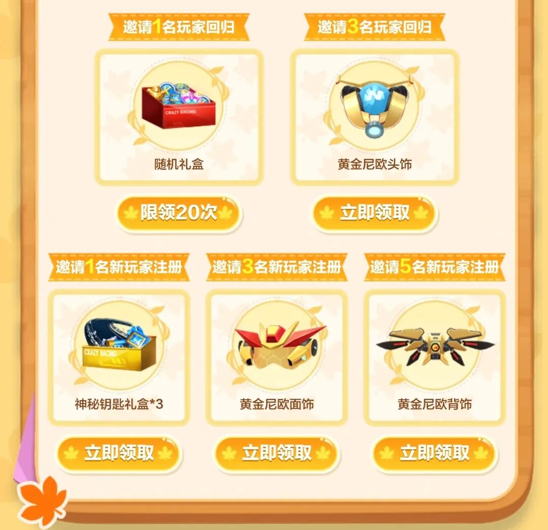 除了完成每日任务集卡兑奖,成功邀请好友注册/回归达到指定次数,也有惊喜奖励等待车友们领取!*温馨提示:好友需先打开活动页面登录账号,再登录游戏方可助力。