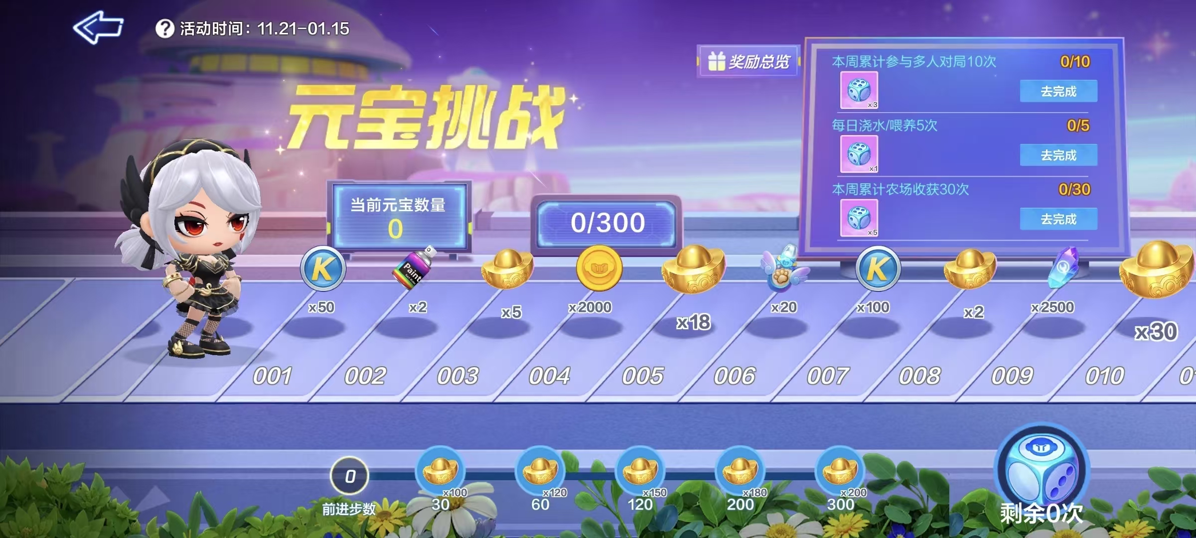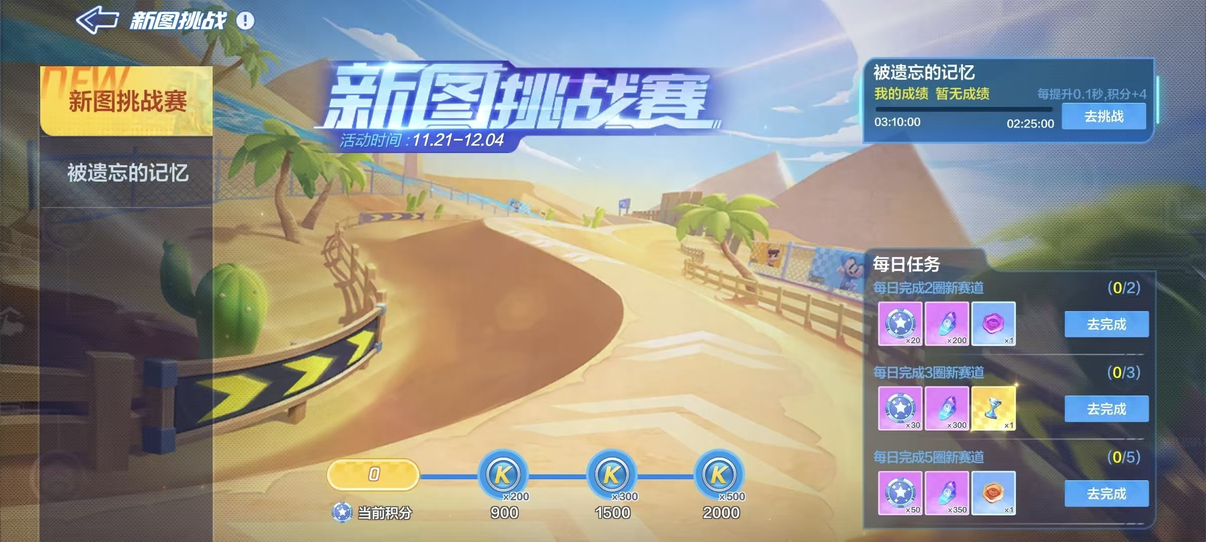 11月21日-12月4日还将开启新图挑战赛,车友们完成新图挑战,即可获得奖励和积分。奖励包括时间沙漏、紫色幸运币和橙色幸运币,其中积分可用于兑换酷币。