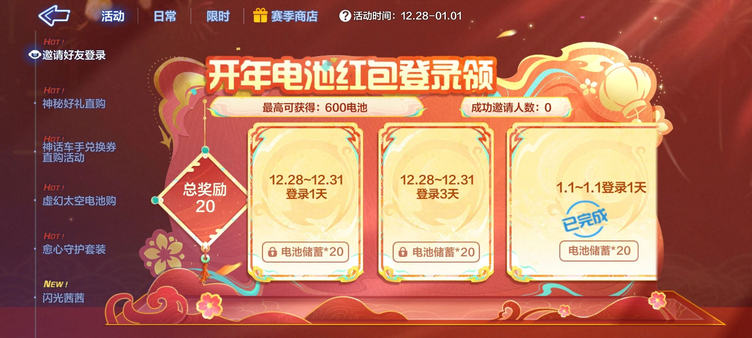辞去旧岁,新年相约!在年尾解锁一份大红包,新的一年一定电池多多福利多多~12月28日起,全新活动开启,连续登录、邀请好友助力,即可获得开年电池红包!在全部指定时间内登录,邀请好友拿满所有奖励,最多可获得高达600电池的新年红包噢!