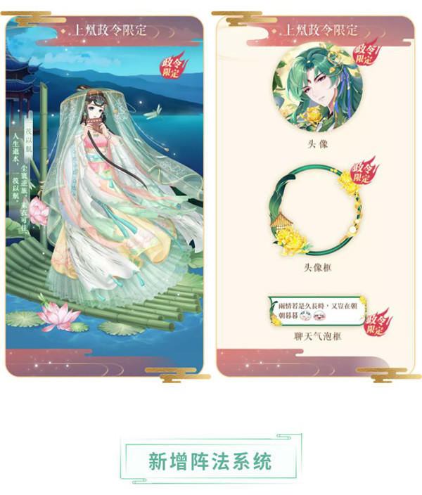 11月9日0:00开启,提升政令等级,购买进阶方案,有机会获得全新头像框和气泡框“满城金甲”、全新头像“青帝惜菊”和