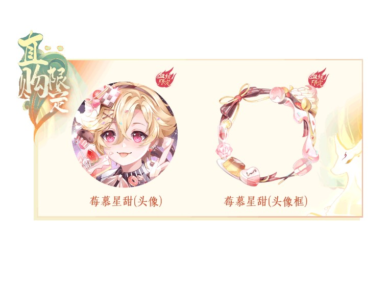 7、活动期间,每次羁绊都有概率获得活动限定奖励甜品宝盒,根据宝盒阶数不同,开启后可能获得橙色珍品礼盒、甜品闪卡礼盒、酸奶蓝莓、椰青冰萃、巴斯克芝士、柠檬薰衣草等各类稀有道具;可通过消耗紫晶币在【活动礼包】处直购动态头像/头像框/气泡框“莓慕星甜”