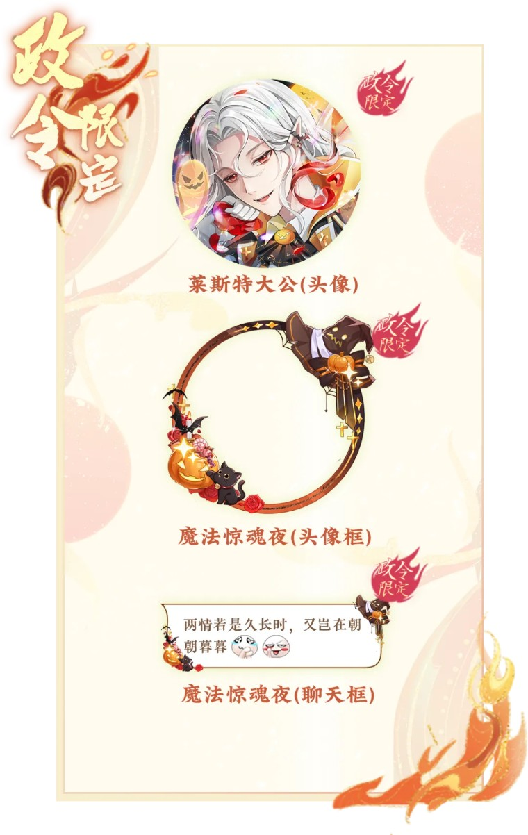 新的一期上凰政令将于10月10日0:00开启,提升政令等级,购买进阶方案,有机会获得全新头像“莱斯特大公”,头像框/气泡框“魔法惊魂夜”