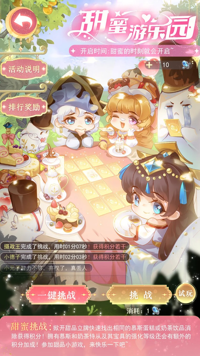 6、活动期间,不花费甜蜜游乐园入场券可以进行试玩,试玩不消耗次数,不记录积分,也不会获得奖励