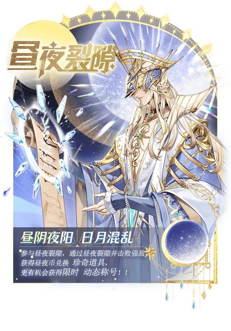 3、【昼夜裂隙·昼阴】在每天早上08:00至晚上19:59:59开启;消耗阳炎之钥开启挑战,昼阴玩法中,每一轮有五波怪物,前4波为日光狮和月光狮,第5波为不灭邪神;每击败1个日光狮、月光狮或不灭邪神获得对应积分与昼夜币,轮数越靠后获得的积分与昼夜币越多