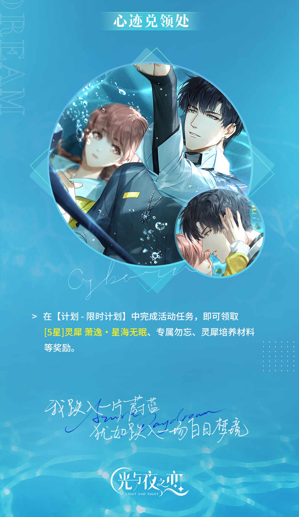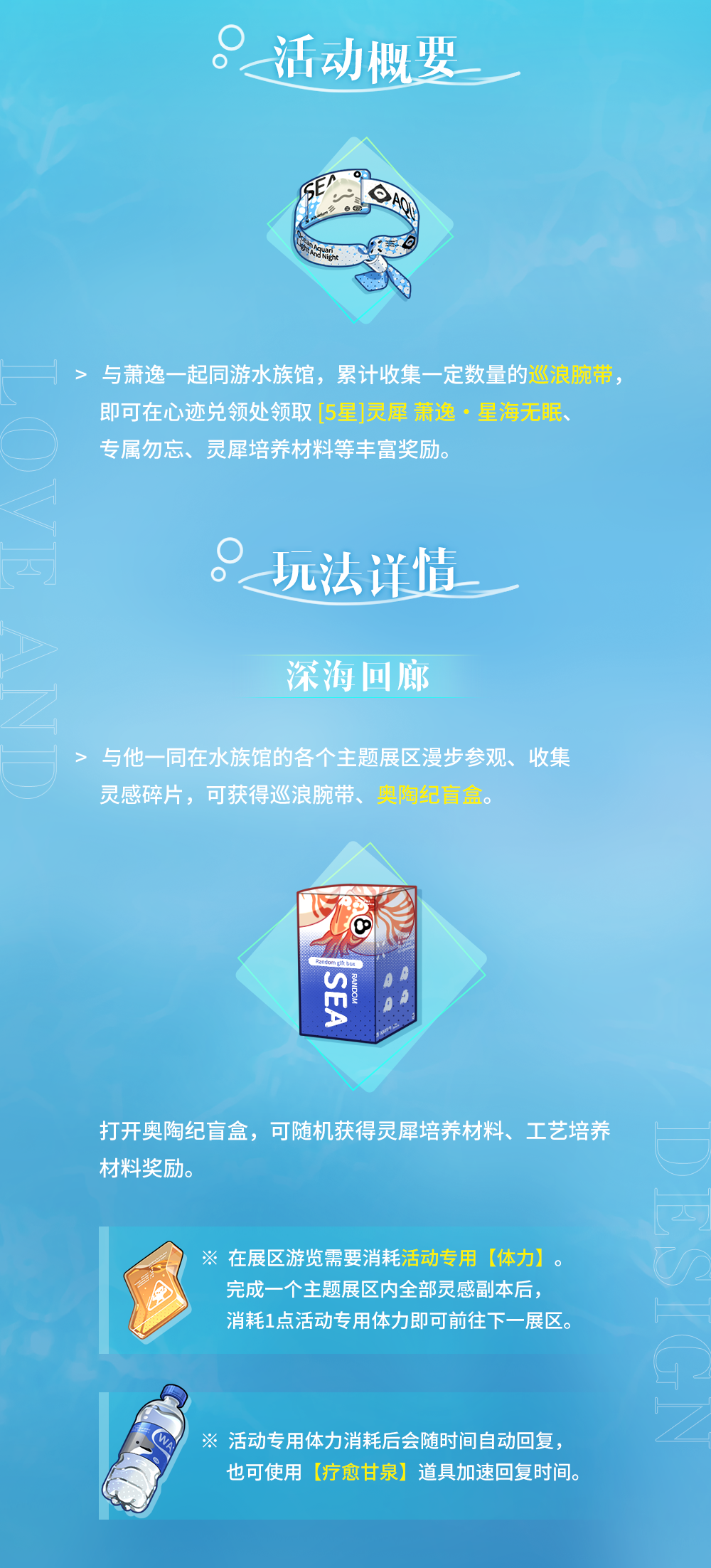 ★ 活动概要:与萧逸一起同游水族馆,累计收集一定数量的【巡浪腕带】,即可在心迹兑领处领取 [5星]灵犀 萧逸·星海无眠、专属勿忘、灵犀培养材料等丰富奖励。