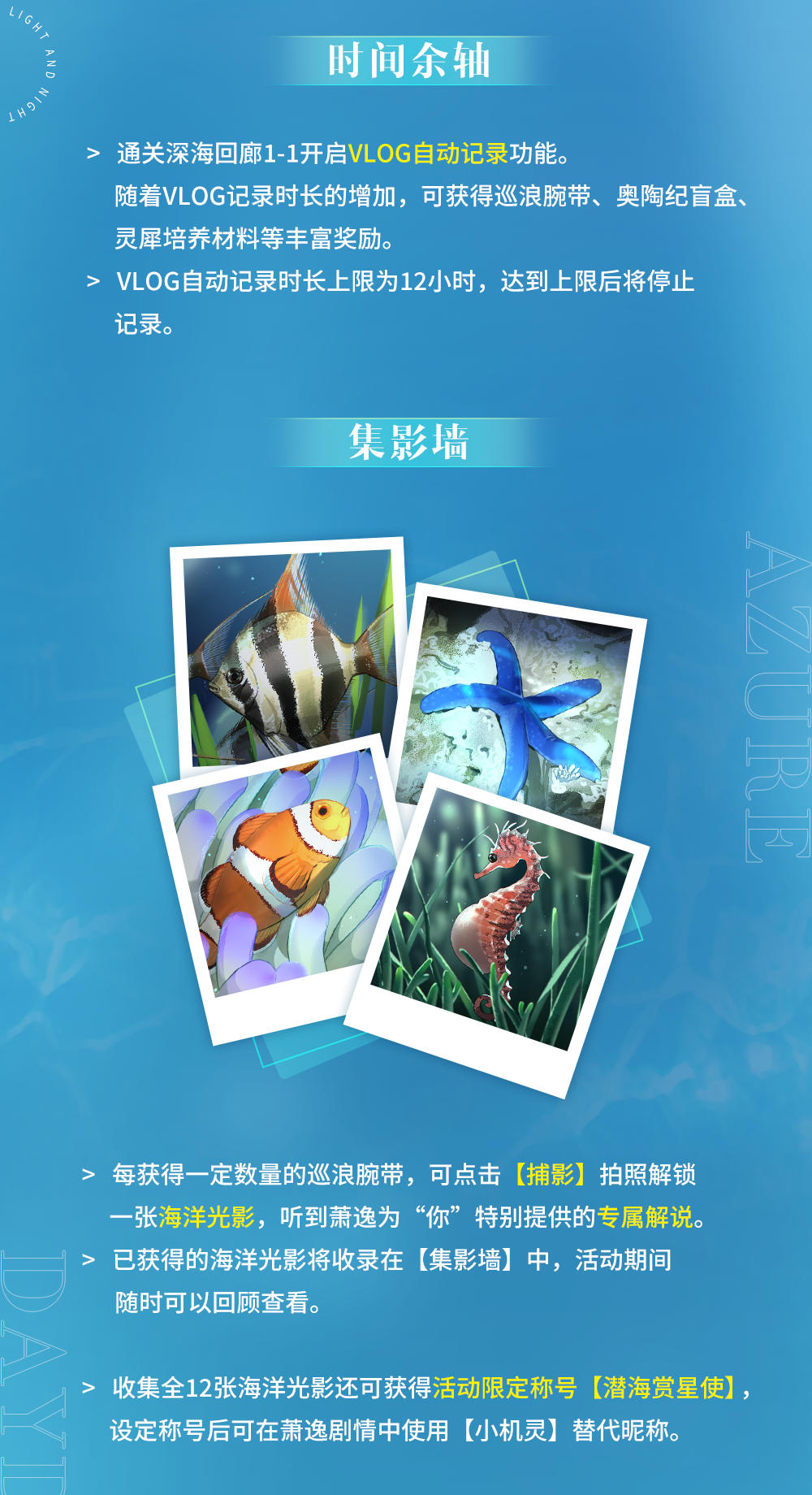 通关深海回廊1-1开启Vlog自动记录功能,随着Vlog记录时长的增加,可获得巡浪腕带、奥陶纪盲盒、灵犀培养材料等丰富奖励。