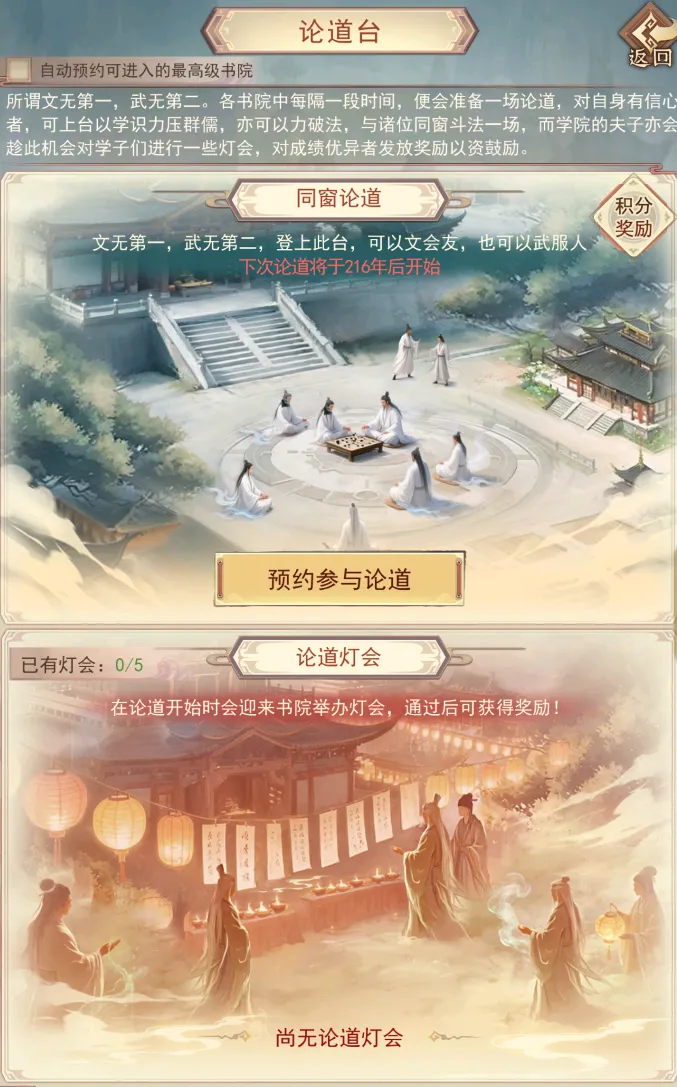 (1) 每座书院皆有一座论道台,书院的儒修们每隔一段时间(每周日开启)都会举办一次论道大会;
