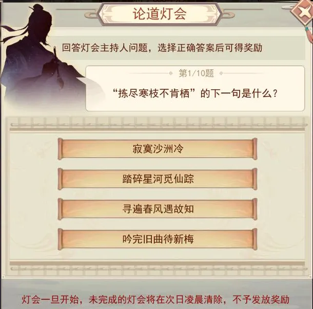 (7) 最多会保留五场未开始答题的灯会,但请注意,灯会一旦开始答题,需在当日解答完,否则将会在次日清除该场灯会,且不会发放任何奖励。