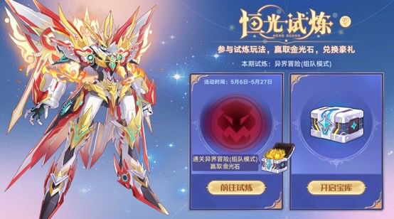 1、活动期间参与试炼玩法——异界冒险(组队模式),挑战成功即可获得对应的金光石,消耗金光石即可在恒光宝库中兑换奥拉辉石等各种丰厚奖励;