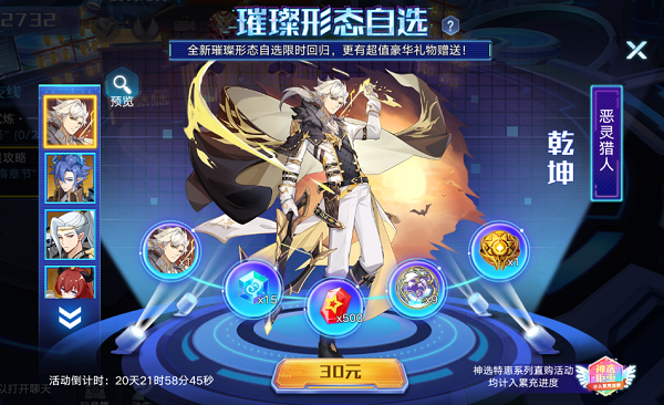 1、璀璨形态精彩回归,购买30元璀璨形态礼包即可自选获得1款璀璨形态,同时还可获得超值道具奖励:奥拉晶石X15、星之起源X1、星币X500、永恒绘灵X9。