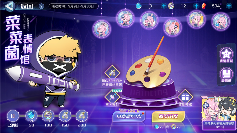 2.本周为表情每天免费单抽特权,每天可在菜菜菌表情馆免费调绘1次。