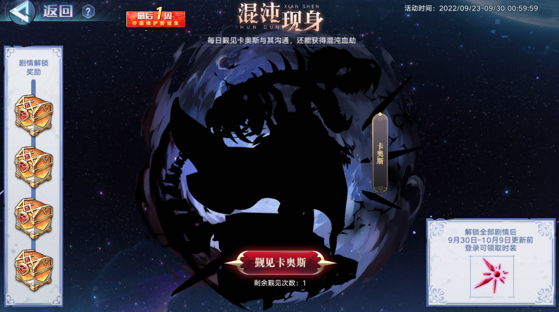 3.在完成所有觐见剧情后,才能在9月30日维护更新后至10月9日更新前登录领取时装【混沌血劫】。