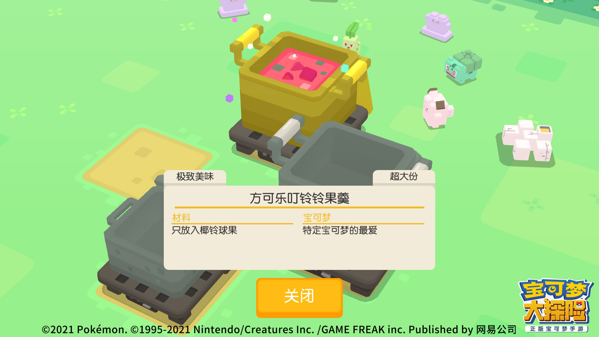 这次重磅推出的圣诞特别料理“ 方可乐叮铃铃果羹”,所需要的制作材料是椰铃球果~探险家们可以烹饪此款料理与前来进食的宝可梦成为伙伴!