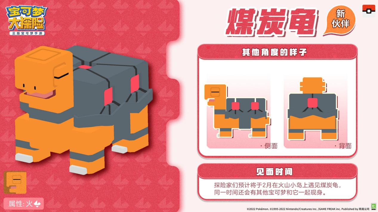 本次亮相中内心最为“火热”的宝可梦当属“煤炭龟”, 有着乌龟的外形,身体是橘色,甲壳颜色是黑色,体内燃烧着煤炭之火。