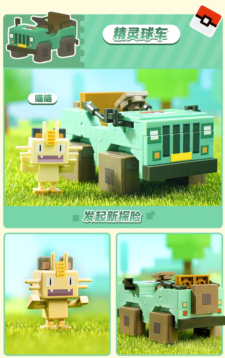 这次还有一辆酷炫又稳重的探险载具,随时随地等着带我们去探索神秘藏宝图,邂逅各种各样的宝可梦伙伴,顶盖上的精灵球印花象征着探险家们的最高目标。身旁的喵喵是我们的向导,就是不知道它是不是也能和火箭队的那只一样说人话呢?
