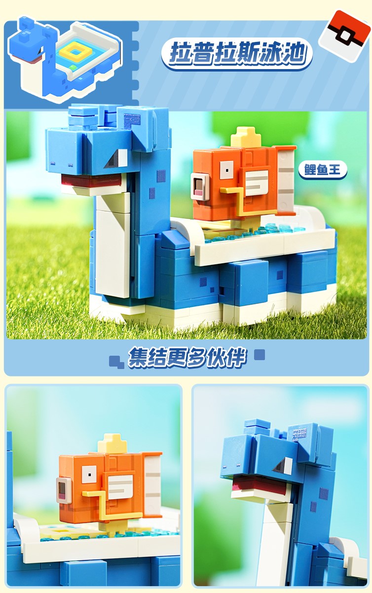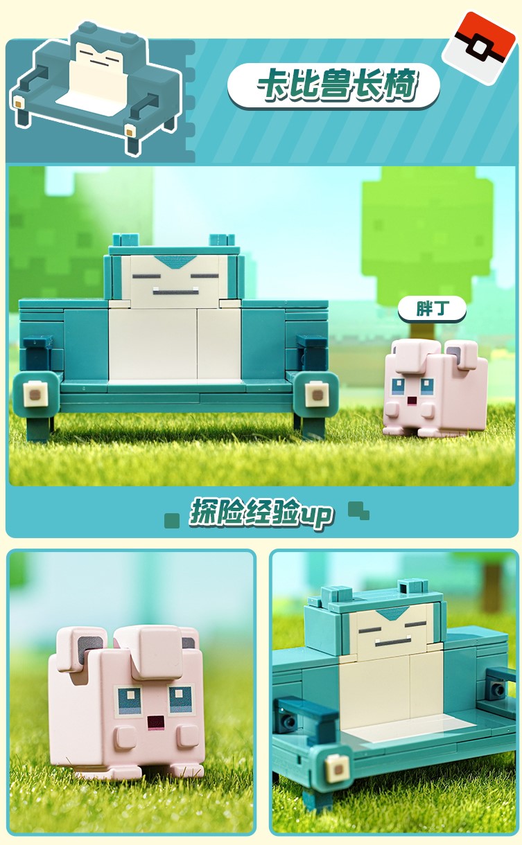 皮卡丘拱门,卡比兽长椅、拉普拉斯泳池、探险载具等探险大本营道具化身萌趣积木,通过轻松拼搭就能开玩。