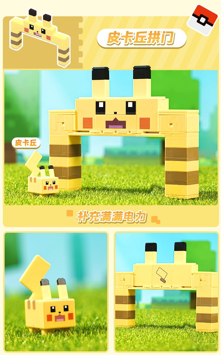 皮卡丘拱门坚固又灵动,有皮神的大脑袋坐镇,一眼过去就是满满的安心,两边的墩柱上还有标志性的棕色竖条纹,钢铁尾巴与我们同在!有趣的是,皮卡丘拱门的同盒里还有方块皮卡丘摆件,可谓双倍的可爱!