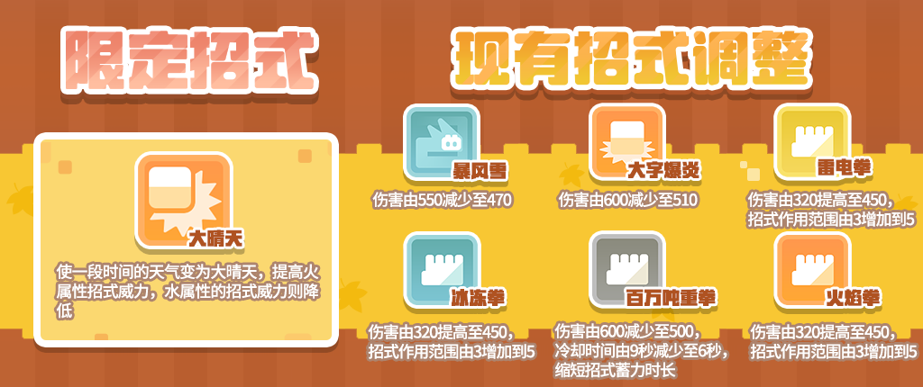 【7】火焰拳:伤害由320提高至450,招式作用范围由3增加到5。