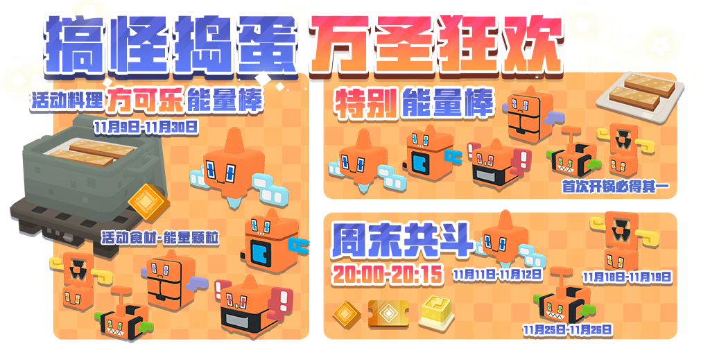 11月9日-11月30日,活动料理“方可乐能量棒”开启,玩家可在活动中获得活动食材能量颗粒。